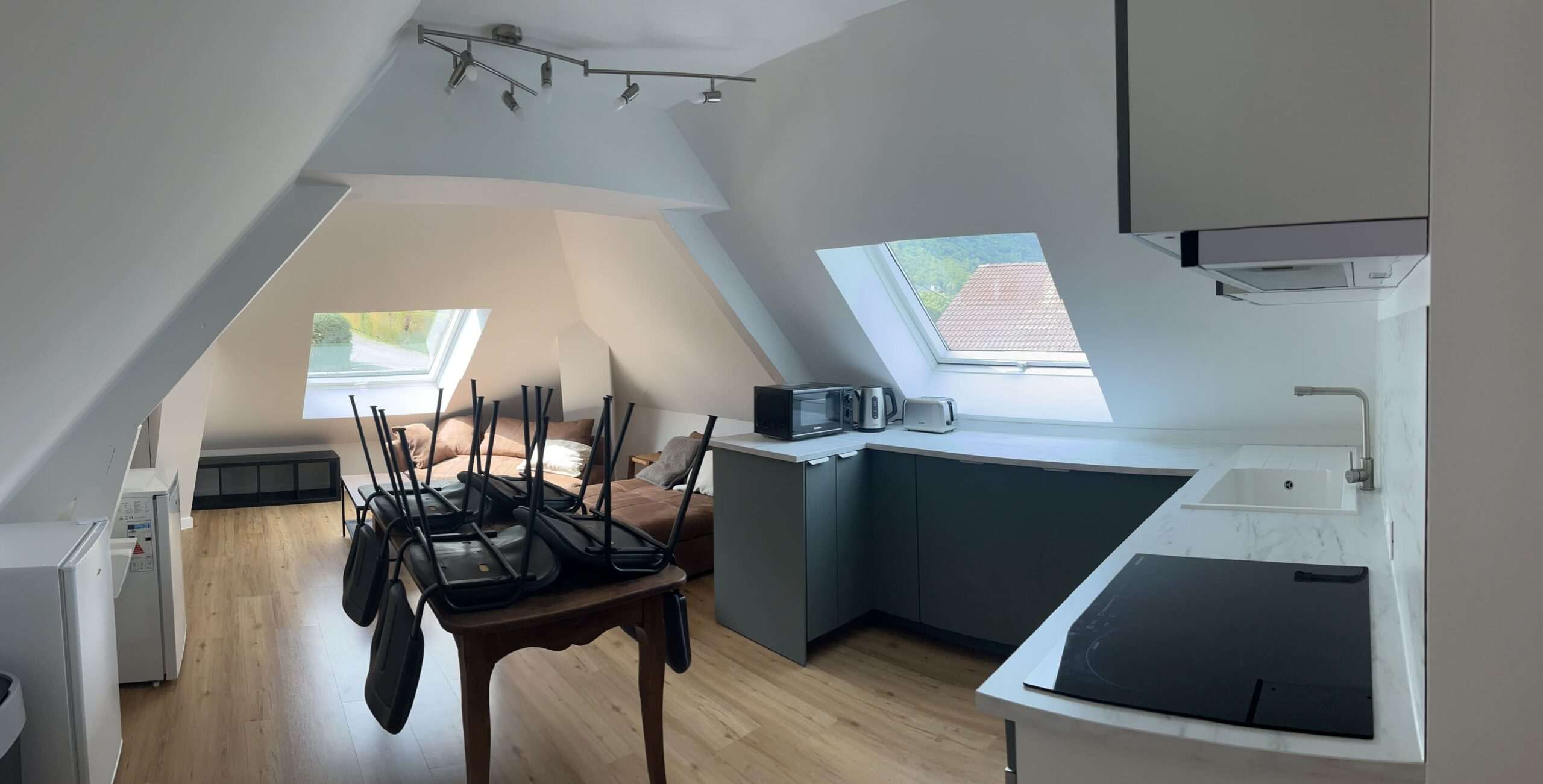 Le projet a nécessité la création d’un accès extérieur indépendant, ainsi que la mise en œuvre d’un plancher technique pour le passage des alimentations et des réseaux. Chaque appartement a été entièrement conçu pour une occupation confortable et optimisée : pièce de vie, cuisine, salle de bain, chambre, le tout dans une logique simple et efficace.